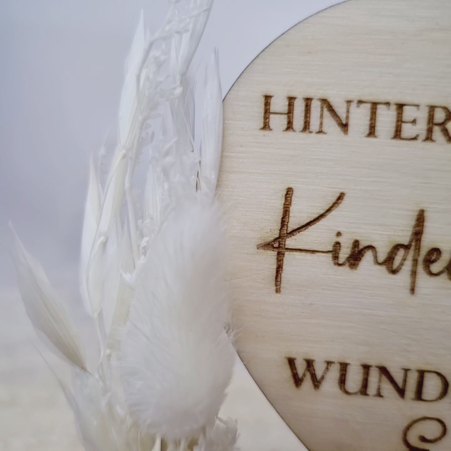 Der Aufsteller wird aus Birkenholz mit den gewählten Text gelasert und mit einer Trockenblume verziert. Die Schokopraline wird mit einem Schleifenband befestigt.