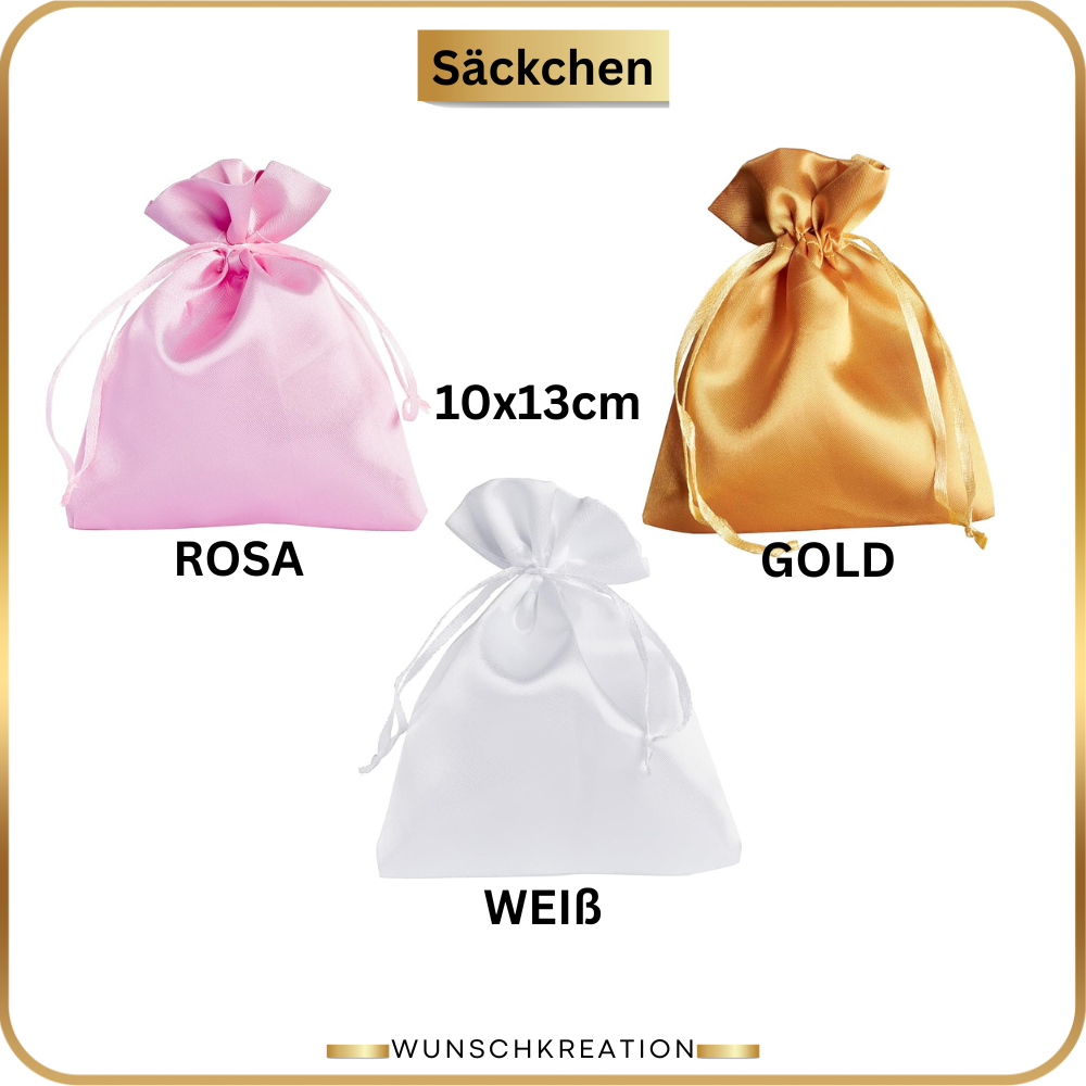 Optionales Set: 24 Satinsäckchen (10 x 13 cm) für einfachen, stilvollen Einsatz, Farben: Rosa, Weiß oder Gold